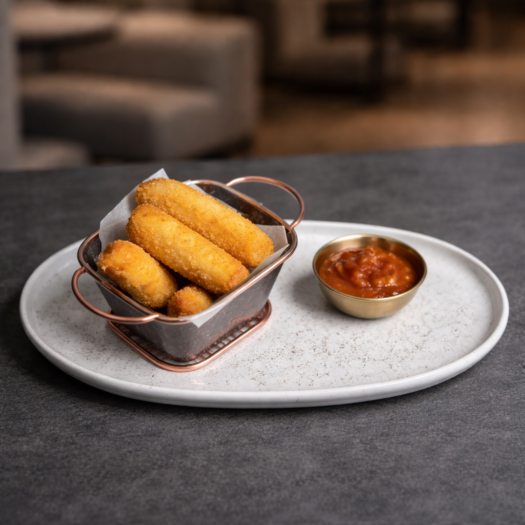 Golden-fried mozzarella sticks with a gooey cheese center, served with marinara sauce