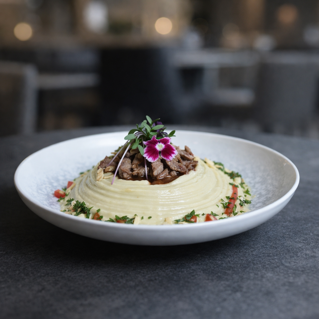 Creamy hummus topped with seasoned ground beef, pine nuts
