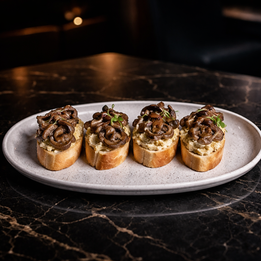 Toasted baguette slices topped with creamy mushrooms and herbs for a savory treat