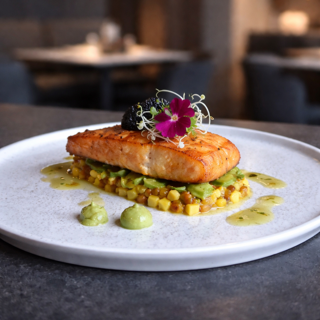 Succulent sea bass fillet, grilled to perfection with a hint of lemon and fresh herbs, served with seasonal sides